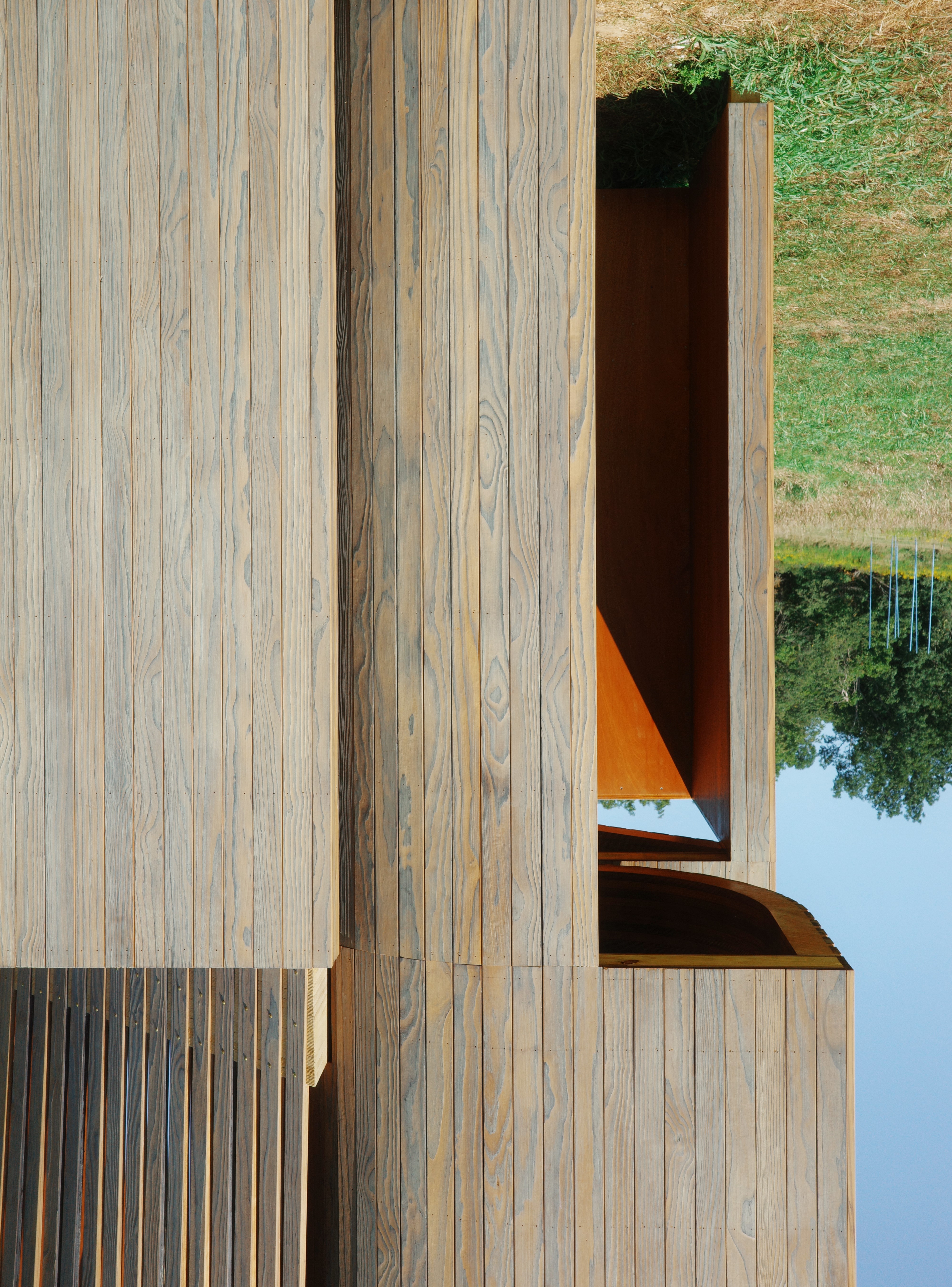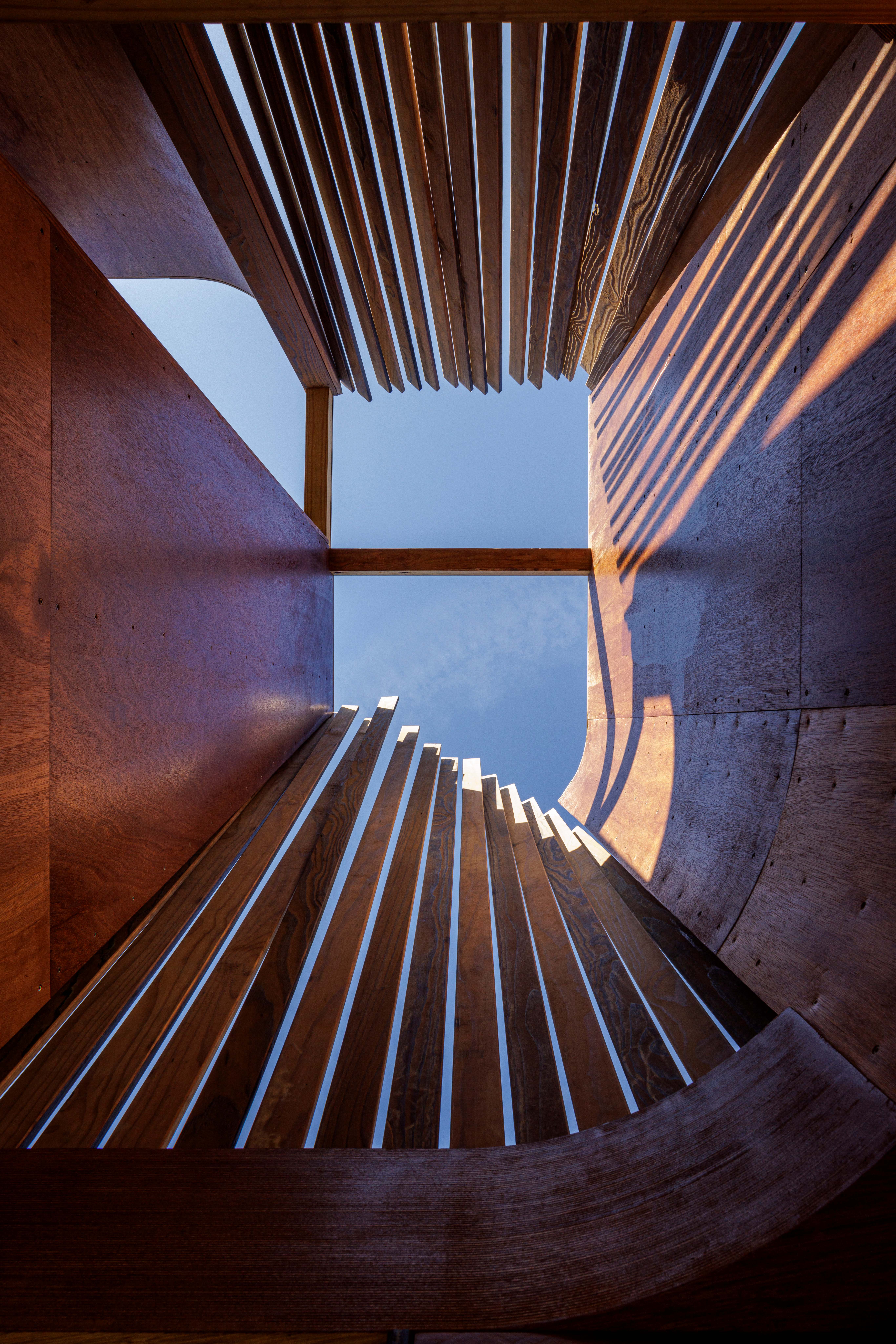 These vessels are sculptural in nature, employing disciplined geometry developed with dimensional lumber in mind. The aggregation of individual slats, held together by a unique cradle attachment, allows the structure to clatter and sway in the wind while visually merging the backdrop of sky, trees, and land with the prominent, tactile graining of the pine cladding.