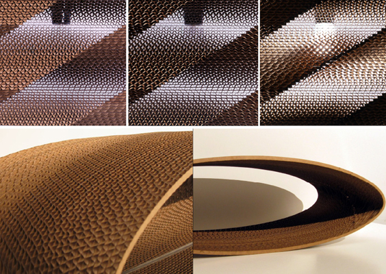 Corrulamp-1 is constructed by stacking layers of laser-cut corrugated cardboard to form a single elliptical lamp shade. The cut of each layer rotates a consistent amount relative to the direction of the cardboard’s corrugation; the result is rotational gradation of texture and light emitted across the surface of the volume that varies as one moves around the lamp. The surface fluctuations act against the purity of the form, with fluctuations from solidity to transparency as the grain of the corrugation shifts from perpendicular to parallel. The piece can be constructed from three CAD laser cutting files and nine 18″x 24″ sheets of cardboard.