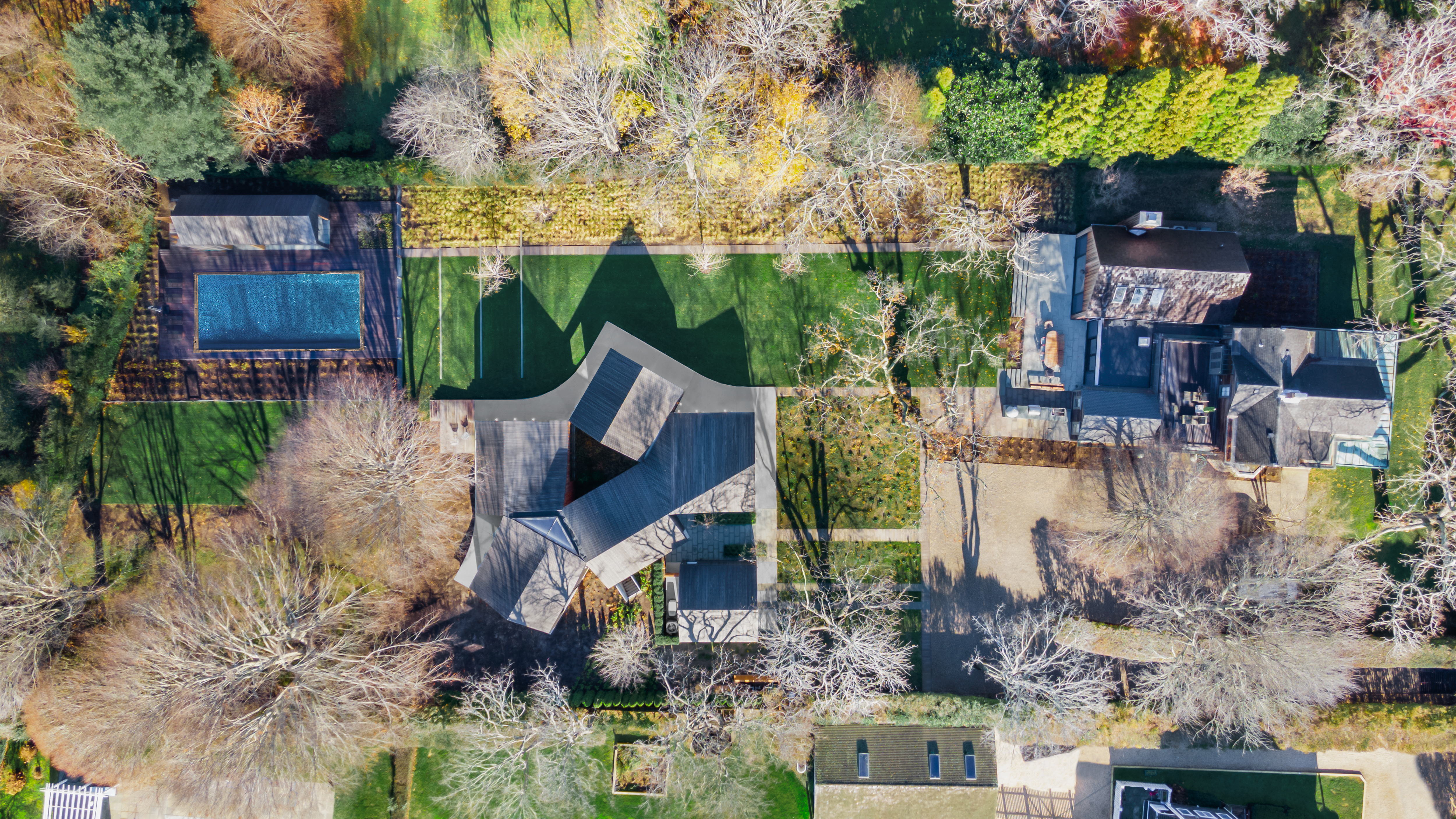 The 2,600 square foot house contains 2 bedrooms, 3 bathrooms, kitchen, living spaces, an outdoor porch and garage. Living spaces open directly onto a landscape designed for entertaining: central court, meadow and pool house. The kitchen, located at the center of the house, is adjacent to a “left-over” triangular court and looks through the open porch that frames views of landscape beyond. Living spaces and kitchen are linked to one another to serve as a large open space emphasizing the flow of continuous ruled ceiling geometry, while bedrooms feature framed views of the site’s mature and gnarled trees for privacy. Standing in the middle of the site, one can glimpse archetypal gables silhouetted against the undulating roof geometries, emphasizing the evolution of the typology in a layering of forms.