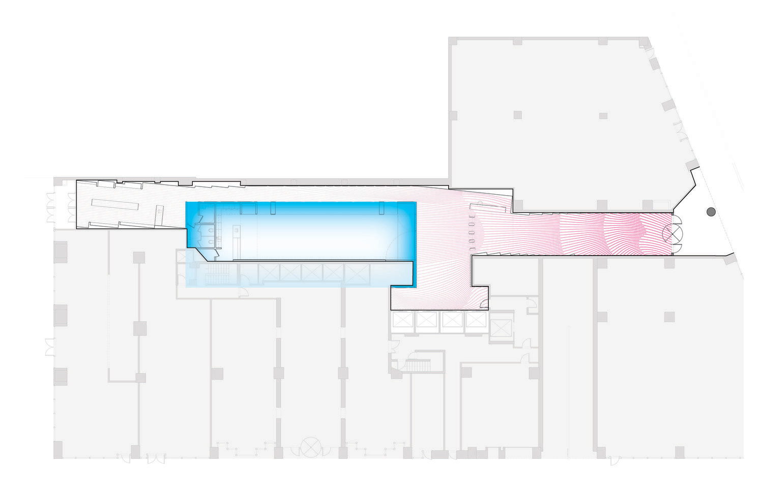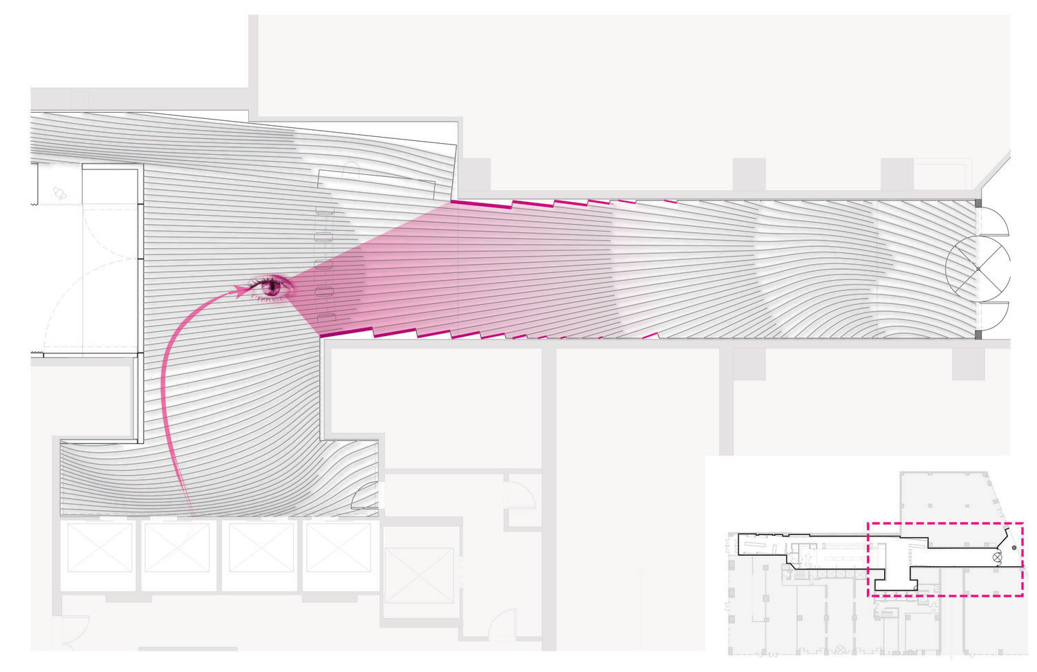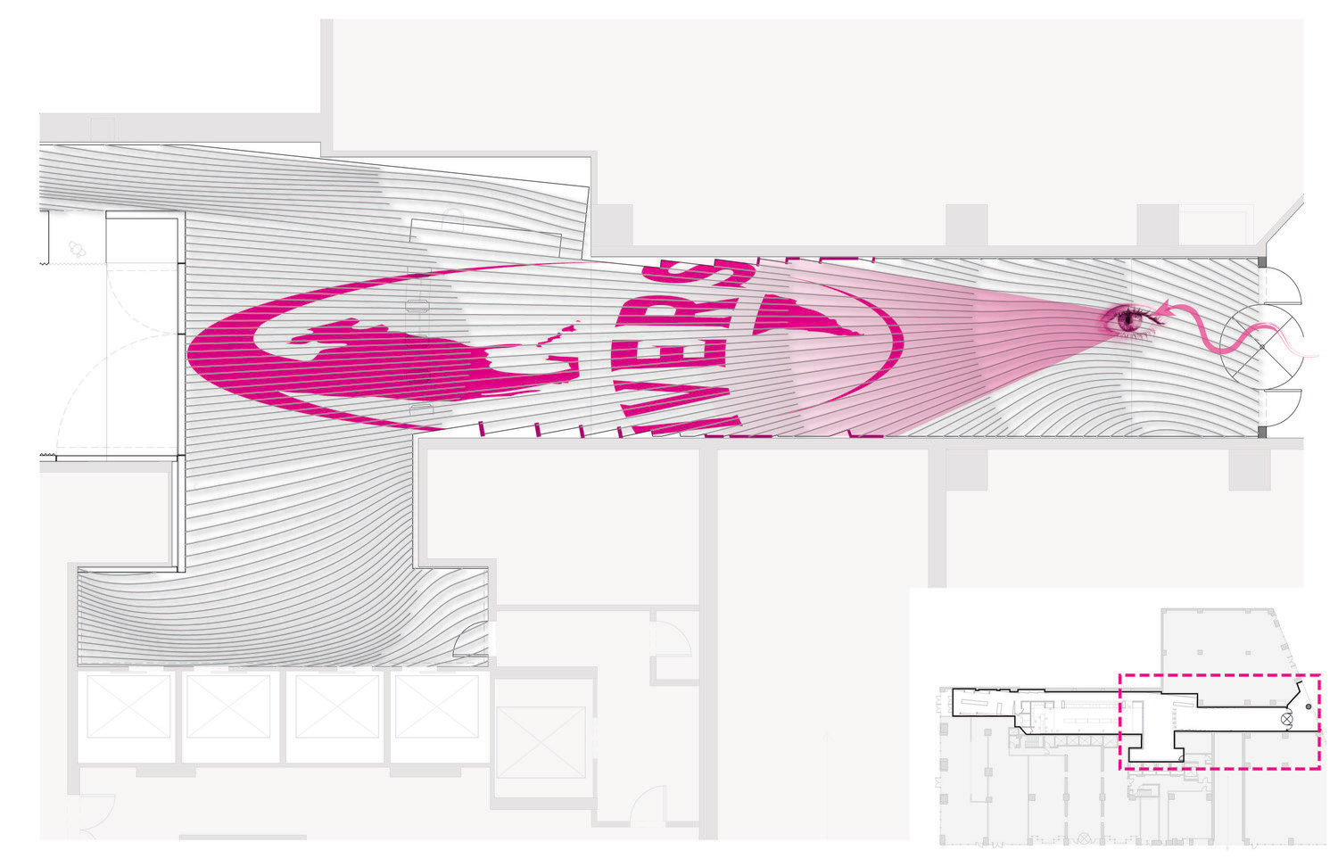 Young Projects’ competition proposal for the Universal Music Group lobby renovation sought to harness the optical principle of anamorphosis in a contemporary architectural design. A superscaled version of Universal’s logo immediately greets visitors to the building. This signage is gradually revealed to be singularly focused to the building’s entry and dissolves into abstracted graphic markings as visitors move throughout the space. On the ceiling, gently curving plaster fins reinforce the lobby’s perspectival focus and act as diffusers for concealed lighting and mechanical systems.